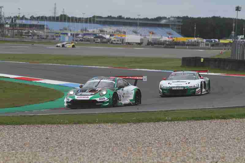 Maximilian Götz/Tim Heinemann mussten sich nach dem man den Reifen gewechselt hatte, wieder auf Rang sechs einreihen. Schnellste GT4-Fahrer waren Denis Bulatov/Leon Koslowski auf Rang acht. Mit einem Vorsprung von über 37 Sekunden war Salman Owega schon wieder auf und davon gefahren. Marvin Kirchhöfer/Heiko Neumann hatten in den letzten neun Minuten sich Christer Jöns/Carrie Schreiner zu Recht gelegt und konnten nachdem die Audi-Piloten etwas zu weit raus kamen, vorbeigehen und Platz drei einnehmen. Man fuhr schnellere Zeiten als die Zweitplatzierten und versuchte nun in der Schlussphase noch auf Rang zwei zu fahren. Die McLaren-Piloten mussten absolute Kampflinie fahren.