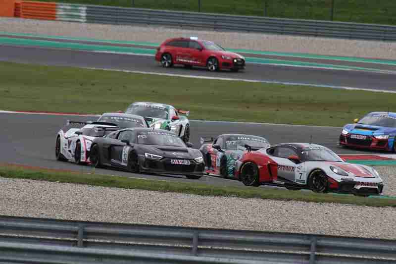 Das zweite Rennen der GTC am Sonntagnachmittag wurde als wet-race erklärt. Auch dieser fliegende Start konnte nach der Einführungsrunde ohne Probleme von statten gehen. Marvin Kirchhöfer konnte seine Pole-Position behaupten. Salman Owega versuchte unterdessen sich an Maximilian Götz vorbei zu drängen. Doch dieser schlug ihm die Türe vor der Nase zu. Überall im Feld wurde bereits hart um jede Position gefightet. Bereits in der ersten Runde hatte sich der Niederländer Rick Bouthoom ins Kiesbett eingegraben. Er wurde dort hinausgezogen und konnte danach dem Feld hinterher eilen. Marvin Kirchhöfer hatte bereits einen Vorsprung von 1,829 Sekunden herausgefahren. Luca Arnold auf Rang acht war der schnellste GT4-Pilot im Feld.