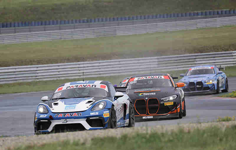 Die jetzt auf Slicks unterwegs waren, hatten sich verzockt. Beim Start waren schon einige in die Boxengasse abgebogen und zogen Regenreifen auf. Die auf Regenreifen unterwegs waren hatten sich jetzt nach vorne gefahren. Nach der ersten Runde führte weiterhin Marcel Marchewicz, gefolgt von Tom Spitzenberger und Leo Pichler. Sieben Piloten waren unterdessen zum Reifenwechsel in die Box gekommen. Finn Zulauf und Luca Arnold waren auf den Rängen neun und elf unterwegs. Tom Spitzenberger hatte nach zwei Runden die Führung übernommen vor Leo Pichler und Bernd Schaible. Bei Alon Gabby gab es beim Reifenwechsel Probleme. Er stand viel zu lange. Tim Neuser auf Platz vier war der schnellste Pilot aus der GT4.