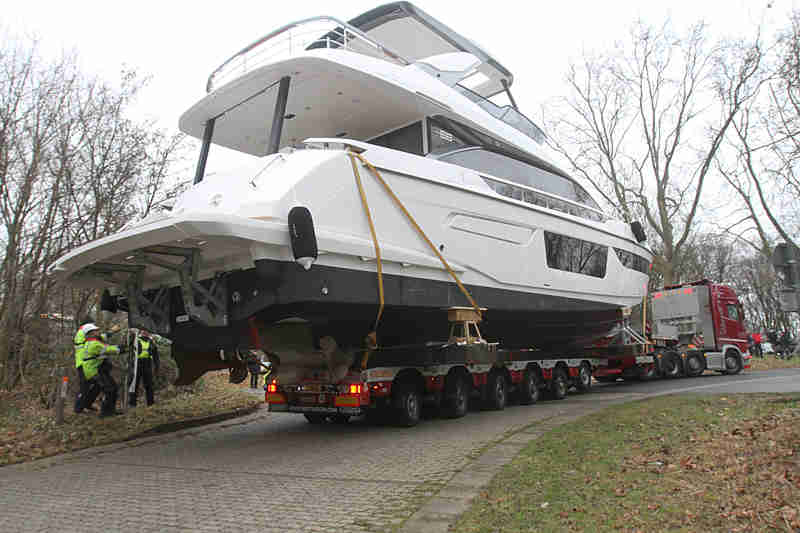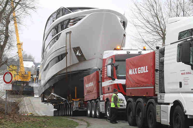 Bedingt durch das Hochwasser und die Höhe der Schiffe auf dem Lastschiff konnten Brücken nicht passiert werden. Am Samstag traf dann der Schiffstransporter an der Bootsrampe beim Rheinkilometer 749 ein.
