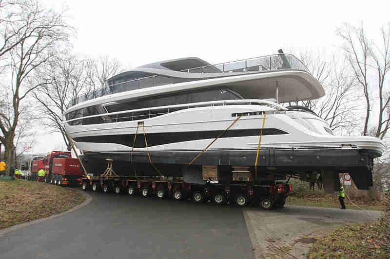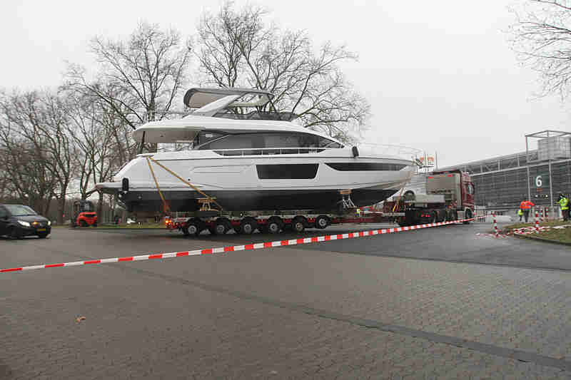 Unter Beobachtung von boot Director Petros Michelidakis wurden die Schiffe an Land gebracht, unter anderen die Princess Y 95, die Größte Yacht auf der Messen die in Halle 6 stehen wird.