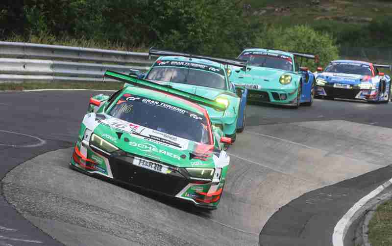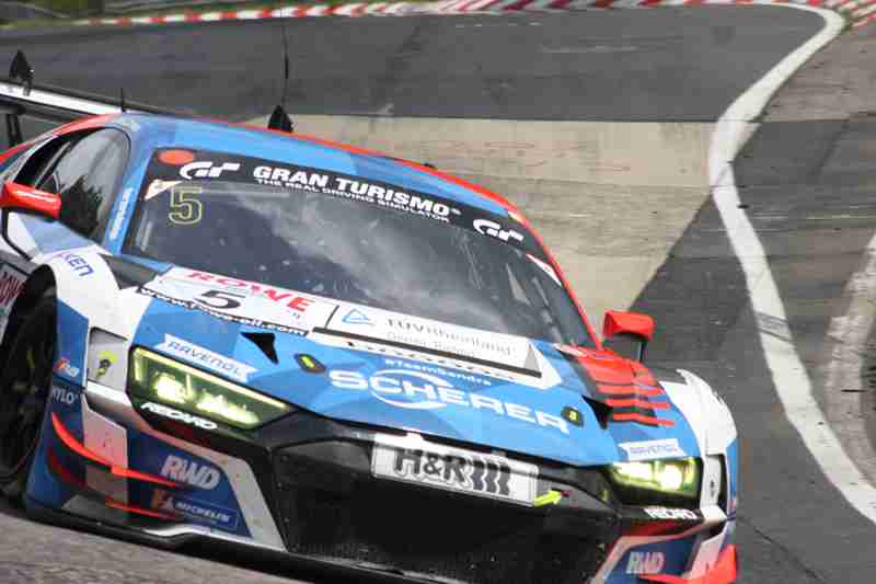 Die Witterungsbedingungen machten Rennen sechs der NLS gleich mehrfach zu einer großen Herausforderung. Nach tiefen Temperaturen im Zeittraining folgte leichter Regen in der Startaufstellung und noch ehe das Rennen begonnen hatte, wurde es zur Pokerpartie. Die meisten Teams gingen auf Nummer sicher und setzten in der Startphase auf Regenreifen. Nach fünf Runden war die Strecke genug abgetrocknet, um auf Slicks zu wechseln. Dies taten auch die beiden Scherer-Audi, die so den ‚kurzen‘ Stint vorzogen. Nach zweieinhalb Stunden setzte stellweise erneut Regen ein. Auch davon ließen sich die beiden Audi-Teams nicht beeindrucken und fuhren den Sieg im spektakulären Paarflug souverän nach Hause. Am Ende jubelte das Team im grünen Audi R8 – Giermaziak, Schramm und Engstler – bei der Siegerehrung ganz oben auf dem Podest. Giermaziak bereits zum zweiten Mal in dieser Saison als Gesamtsieger.