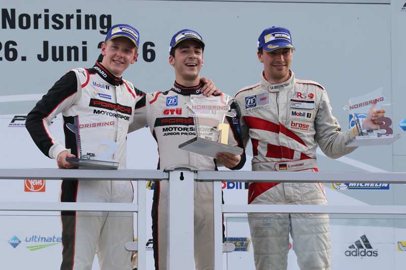 Christian Engelhart (MRS GT-Racing): „Nach der ersten Runde war ich Fünfter. Dann arbeitete ich mich nach vorn. Ich stehe zum ersten Mal am Norisring auf dem Podium und das darf gern so weiter gehen. Am Sonntag ist das 150. Carrera-Cup-Rennen für mein Team MRS. Da wäre ein Podium ein schönes Geschenk.“