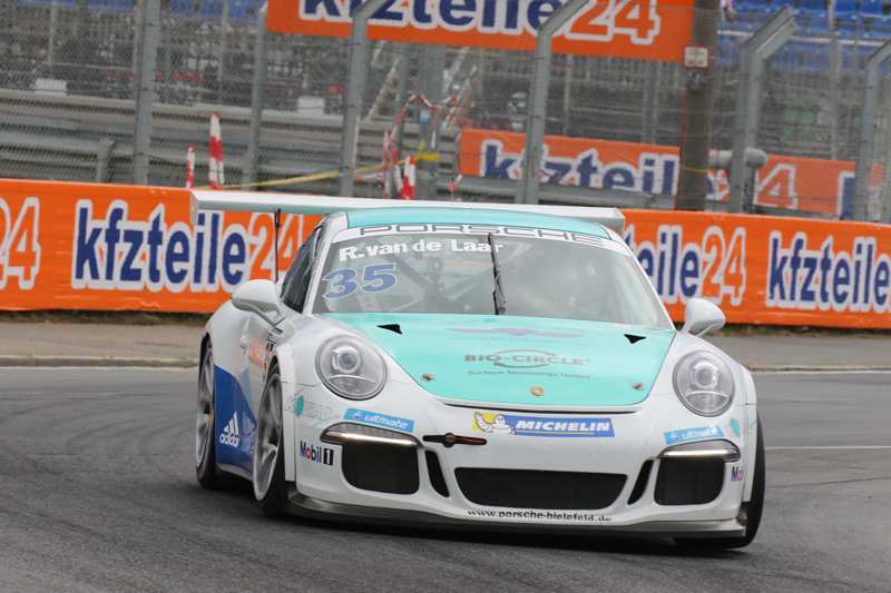 Die Startaufstellungen für beide Rennen mussten die Fahrer am Samstagnachmittag nach dem DTM-Lauf ausfahren. In diesem Qualifying ist die zweitschnellste Runde ausschlaggebend für das Rennen am Samstagnachmittag und die schnellste Runde zählt für das Rennen am Sonntag. Nach zehn gefahrenen Runden hatte sich Sven Müller auf Platz eins gefahren, gefolgt von Jeffrey Schmidt und Dennis Olsen. Zu dieser Zeit hatte Luca Rettenbacher auf Rang acht zu viel riskiert, mit der Folge das er in die Mauer einschlug und seinen Porsche dann links neben der Strecke abstellte. Die Rennleitung unterbrach das Zeittraining mit der roten Flagge um den Havaristen in aller Ruhe bergen zu können. Sie kamen nun alle wieder in die Boxengasse gefahren und warteten darauf, dass das Qualifying wieder frei gegeben wird.