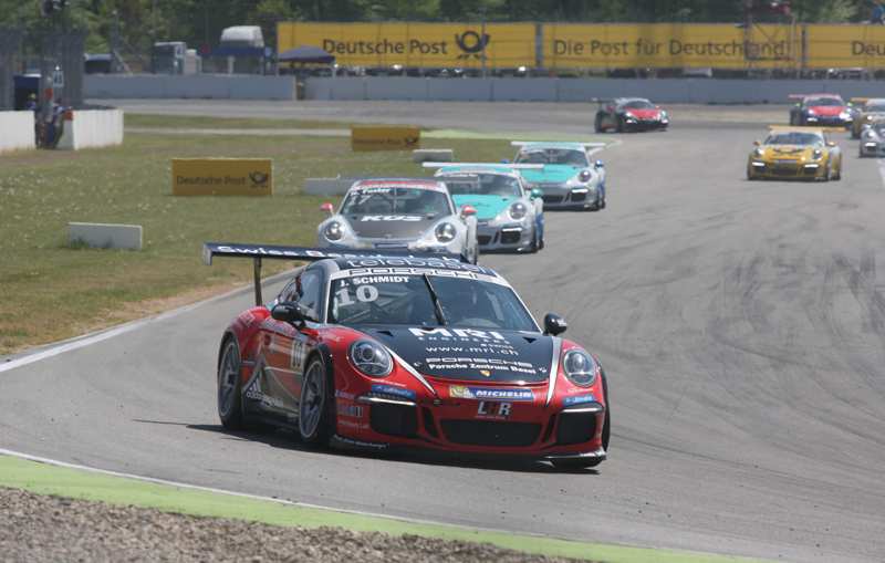 Das zweite Rennen des Porsche Carrera Cup fand am Sonntagmorgen statt. Das Wetter spielte so wie am Vortag mit. Nach der Einführungsrunde funktionierte der Start ohne weiteres. Christian Engelhart, der von der Pole-Position aus ins Rennen gegangen war, konnte seine Position nicht halten, denn Jeffrey Schmidt übernahm die Führung. Nach der ersten Runde führte der Schweizer vor Christian Engelhart und Dennis Olsen. Sven Müller hatte einen Platz eingebüst. Wenig später waren einige der Fahrer etwas von der Strecke abgekommen. Sie konnten aber alle ihre Fahrt weiter fortsetzen. Nach vier gefahrenen Runden hatte sich der Führende bereits mit 2,0 Sekunden vom übrigen Feld abgesetzt.
