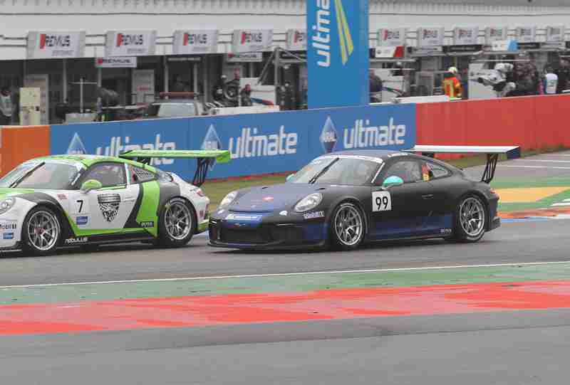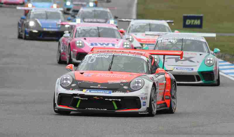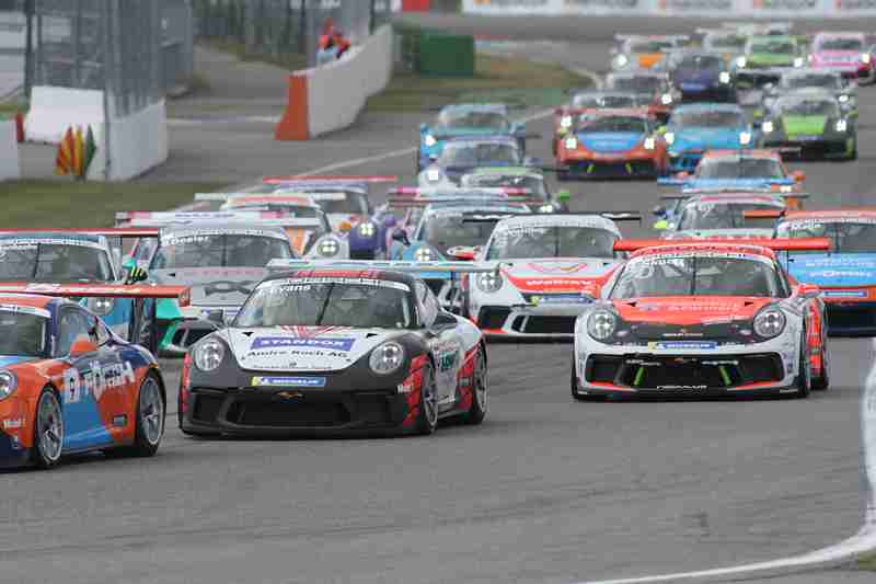 Das erste Rennen des Porsche Carrera Cups fand am Samstagnachmittag bei kaltem Wetter statt. Henric Skoog drehte sich bereits als man in die Startaufstellung fuhr. Da die Ideallinie fast trocken war, startete man auf Slicks. Wobei man sagen musste, dass die rechte Seite doch noch feuchter war. Nach der Einführungsrunde funktionierte der Start und weit gefächert ging es auf die erste Kurve zu. Durch diese kamen sie gut hindurch. Jaxon Evans hatte sich direkt beim Start auf Platz zwei geschoben. In der Parabolika versuchte er den Pole-Setter anzugreifen. Er rutschte etwas raus und Jaap van Lagen konnte seine zweite Position wieder einnehmen. Überall im Feld wurde hart um jede Position gekämpft. Nach der ersten Runde führte weiter Larry ten Voorde mit einem Vorsprung von 2,3 Sekunden vor Jaap van Lagen und Jaxon Evans.