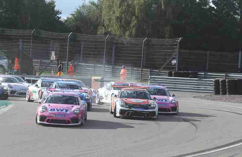 Laurin Heinrich, erst 18 Jahre alt und zum ersten Mal im Porsche Carrera Cup unterwegs, lieferte bis jetzt eine Bombenleistung ab und lag hinter Jaap van Lagen auf Platz acht. Larry ten Voorde auf Rang zwei hatte nichts zu lachen, denn der Druck von Dylan Pereira wurde Runde um Runde immer stärker. Dieser hatte noch Julien Andlauer im Schlepptau. In der zwölften Runde rutsche Laurin Heinrich kurz ins Kiesbett. Danach konnte er sich auf Platz zwölf wieder einreihen. Zu dem Trio um Platz zwei gesellten sich nun auch noch Jaxon Evans und Igor Walilko. Um den achten Platz kämpfte Tim Zimmermann mit Henric Skoog und Jannes Fittje. Von alledem bekam Michael Ammermüller an der Spitze nichts mit, denn er hatte seinen Vorsprung auf 1,649 Sekunden ausgebaut.