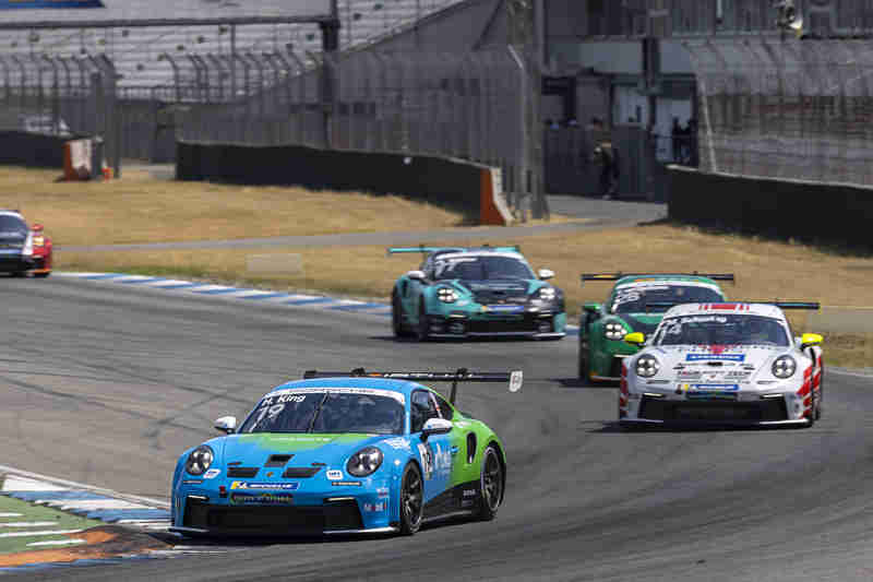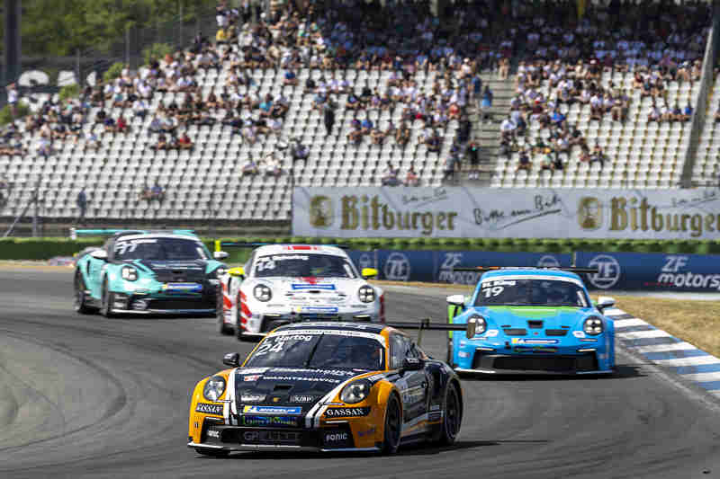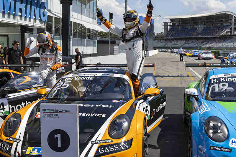 Wie schon am Vortag startete Loek Hartog auch zum vierten Saisonrennen des Porsche Carrera Cup Deutschland aus der Pole-Position. Dieses Mal ließ sich der 20 Jahre alte Niederländer allerdings nicht die Führung schon auf den ersten Metern wieder abjagen. Von der Spitze aus kontrollierte der GP-Elite-Fahrer das Tempo. Und spätestens, als kurz vor Ende des vierten Saisonlaufs das Safety-Car das Feld einbremste, war ihm der Sieg sicher. Harry King war sich nicht sicher, ob er Loek Hartog ohne die Safety-Car-Phase am Ende noch hätte attackieren können Deutlich ereignisreicher als für die beiden Erstplatzierten verlief das Rennen für Larry ten Voorde. Der Sieger des Samstagslaufs büßte kurz nach dem Start eine Position ein.