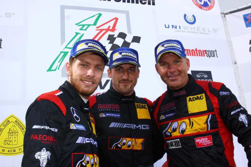 Großer Jubel im Haribo Racing Team, dem Sieger des 39. RCM DMV Grenzlandrennens: Nach 4:00:21,323 Stunden wurde Uwe Alzen im Mercedes-AMG GT3 als Erster abgewinkt. Zusammen mit Jan Seyffarth und Lance David Arnold stand so für die in Bonn beheimatete Equipe nicht nur der erste Mercedes-AMG-Sieg in der VLN-Saison 2016 zu Buche, sondern auch der erste Teamerfolg seit dem achten Lauf 2010. Damals triumphierten Lucas Luhr und Richard Westbrook im Porsche 911 GT3 R ebenfalls in markanter Goldbären-Optik. Auf den Plätzen zwei und drei beendeten die beiden BMW M6 GT3 von Walkenhorst Motorsport powered by Dunlop das Rennen. Den Markenmix an der Spitze rundeten der Falken-Porsche 911 GT3 R und der Audi R8 LMS von Twin Busch Motorsport auf den Positionen vier und fünf ab. Alexander Mies und Michael Schrey verteidigten die Tabellenführung – souverän fuhr das Duo in der hart umkämpften Cup5-Klasse (BMW M235i Racing Cup) zum sechsten Klassensieg in Folge.