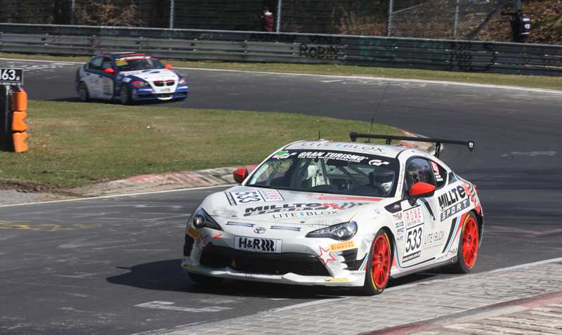 In einem vor allem in der Anfangsphase sehr turbulenten Rennen mit zahlreichen Unfällen kamen auch Teams des TMG GT86 Cup nicht ungeschoren davon. Schon in der dritten Runde ihrer Cup-Premiere erwischte es den Neueinsteiger Pixum Team Adrenalin Motorsport. Der GT86 CS-Cup mit der Startnummer 526 mit Ulf Wickop am Steuer wurde unverschuldet von einem Konkurrenten in einen Unfall verwickelt. „Unser Fahreratte nicht den Hauch einer Chance und wurde regelrecht abgeschossen“, kommentierte Teamchef Mattias Unger den Zwischenfall, den Cup-Debütant Wickop unbeschadet überstand.